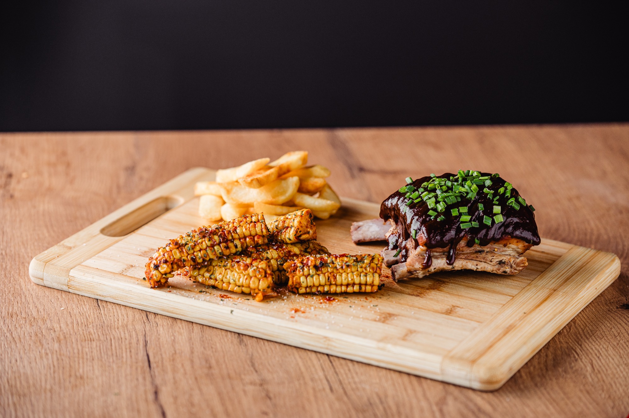 Porcja glazurowanego żebra wieprzowego, frytki, stripsy z grillowanej kukurydzy + sos